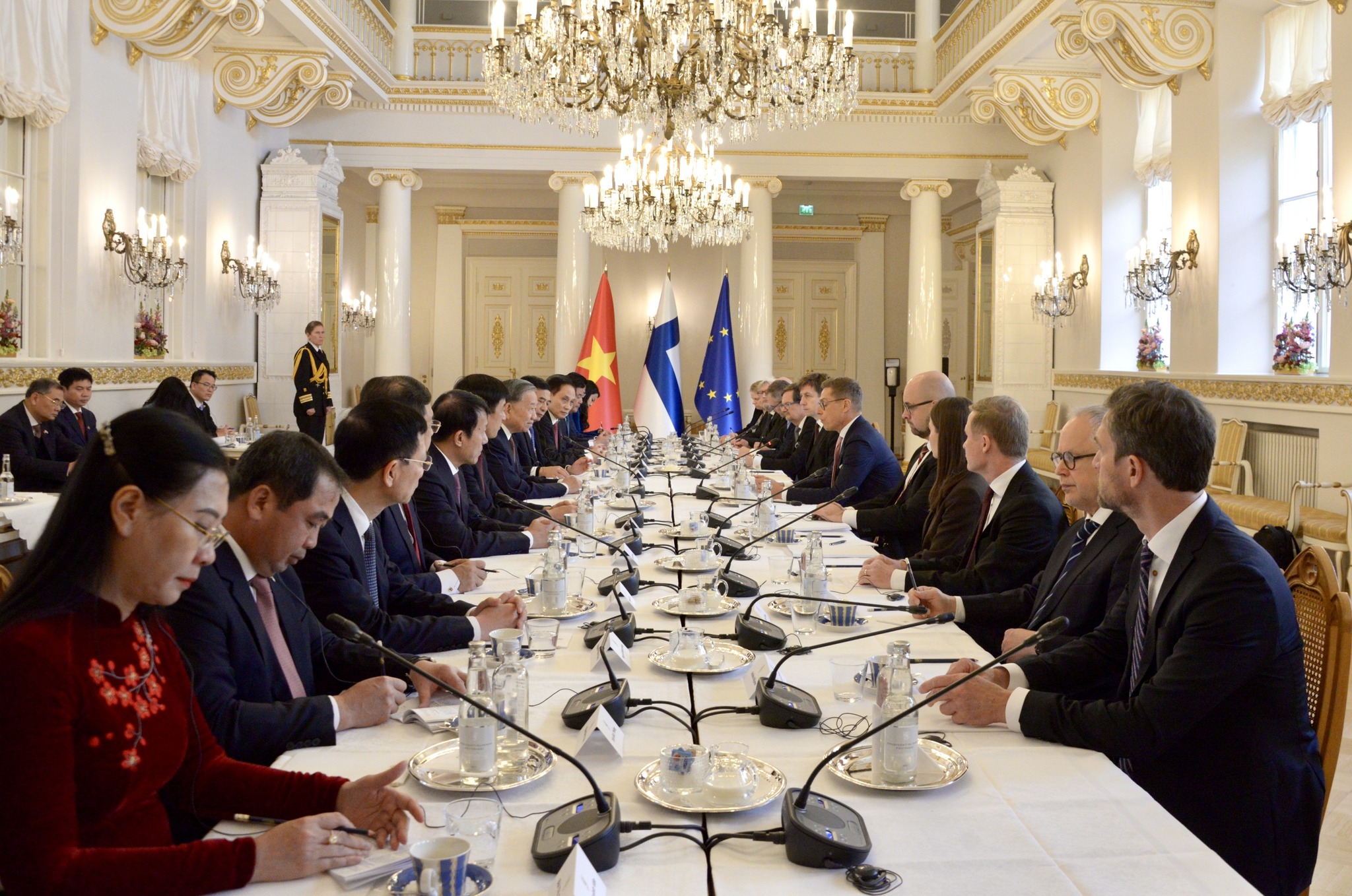 上午10点整,载着苏林总书记一行的车队驶入总统府,芬兰总统亚历山大·斯图布在下车处迎接,热烈欢迎苏林总书记对芬兰进行正式访问。两位领导人登上检阅台,军乐队奏响越南和芬兰两国国歌。