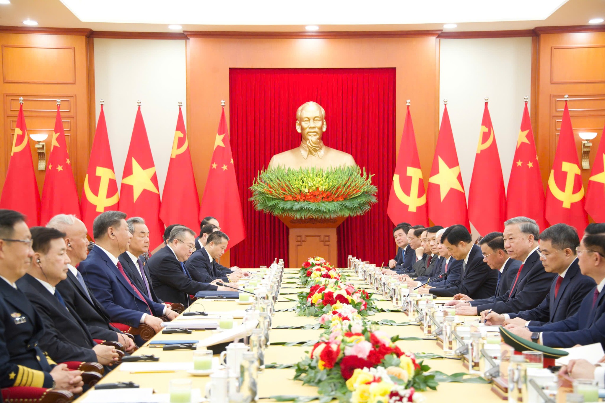 (VOVWORLD) -4月14日下午,越共中央总书记苏林主持仪式,欢迎中共中央总书记、中国国家主席习近平对越南进行国事访问。欢迎仪式结束后,双方举行了会谈。