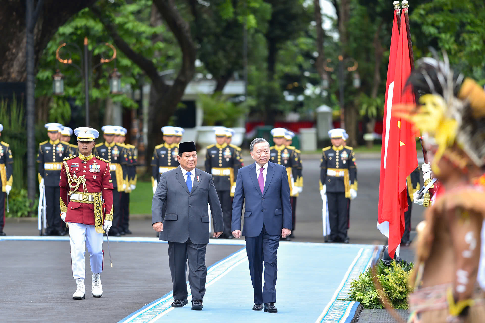 随后,普拉博沃·苏比安托邀请苏林总书记检阅仪仗队。欢迎仪式结束后,两国领导人举行非公开会晤和高层会谈,讨论并提出继续维护、发展两国关系并将其推向新高度的措施。