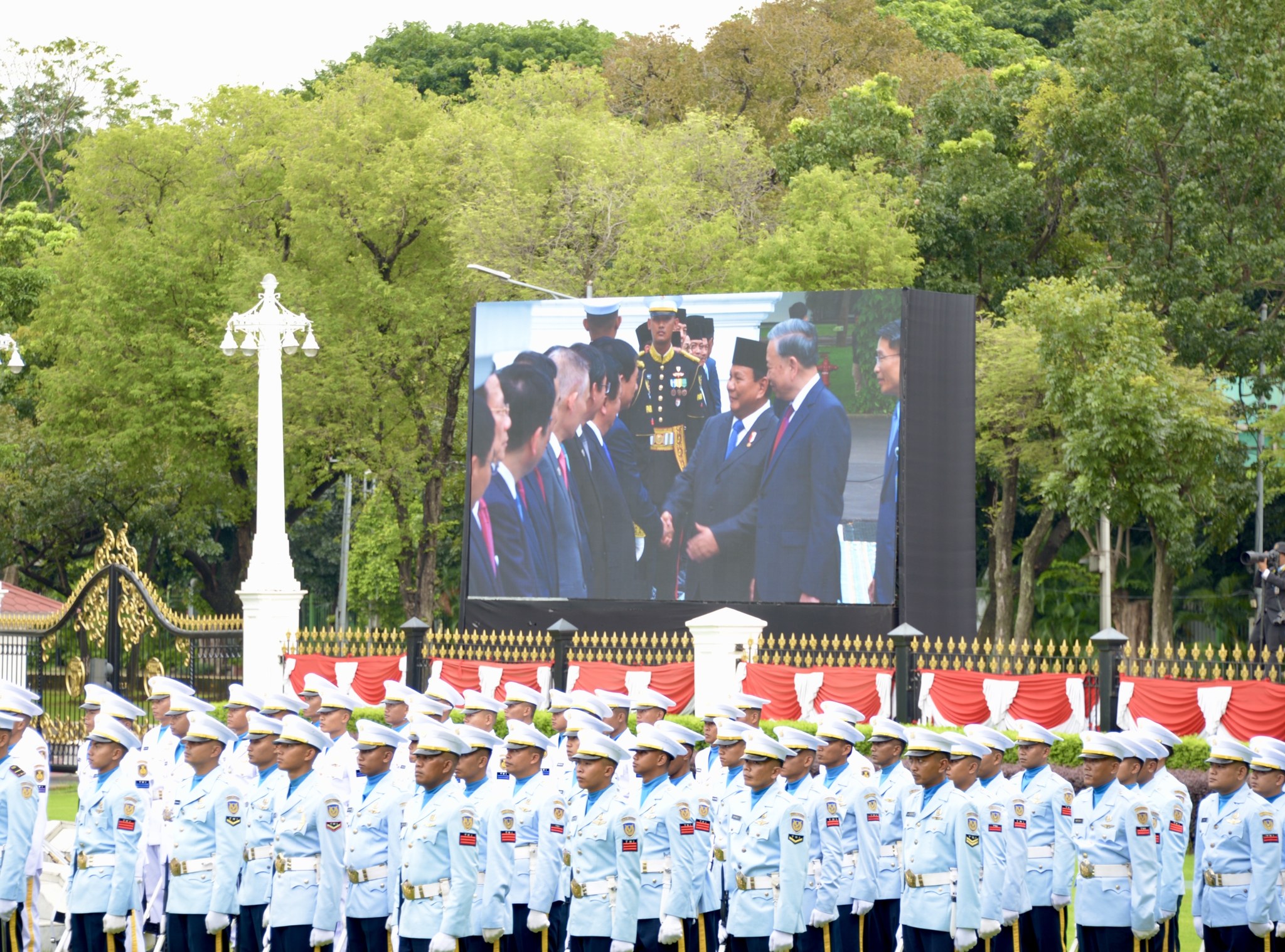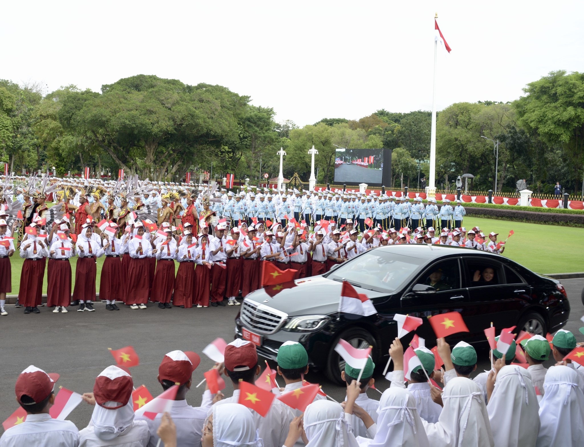 普拉博沃·苏比安托到车门前迎接并邀请苏林总书记走上检阅台,印尼孩子高举两国国旗,向两国领导人挥舞致意。军乐队奏越南、印度尼西亚国歌。与此同时,礼炮鸣21响,欢迎苏林和越南高级代表团的到来。