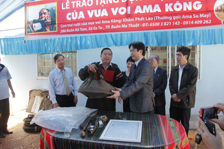 坎菲寮一家决定将这套用具赠给越南民族学博物馆是出于以下希望:“这是先祖的宝物,是猎象工具,但现在不再捕猎了。我不猎象,只是摆在家里,让游客观赏。我父亲去世了。放家里,子孙一人拿走一个,时间久了也就没了,所以我决定送给民族学博物馆,让后人永远都能看到。”