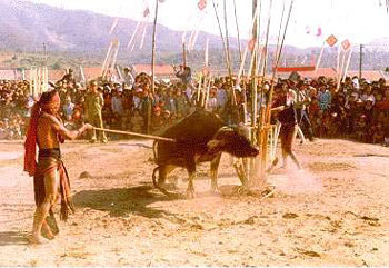 节日当天,人们将水牛洗刷干净并让它吃得饱饱的,随后把它绑在柱子上。柱子长五米,身上雕刻纹饰、野花、旗帜等形象,十分美观。柱顶放着木雕凤凰。