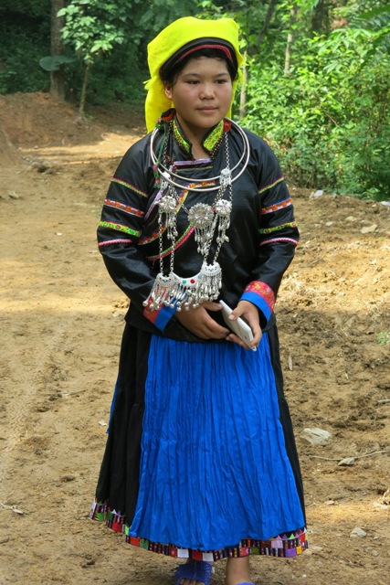 “布标族的服装看起来简单,但做起来很讲究。最难的是裙底边。裙子和围裙的裙身简单些。以前,布标族男性穿丝绸长衣,但现在和其他民族一样穿黑色裤子和上衣。头上围着头巾,颜色以黑色为主,上面缀有红、蓝、紫、黄等颜色布条。”