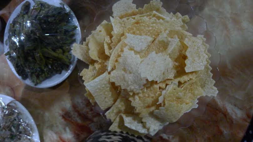 黄大姐说,这是泰族的传统饼食,做法很讲究。她表示:“以前,一般一年当中只有春节才做这种饼,现在随时都可以做。要选很松的木薯,选树根顶部较嫩的地方。先把木薯削下来,放在水上蒸,再舂碎,并做成薄块状,晒干。干了就切成自己喜欢的形状。”