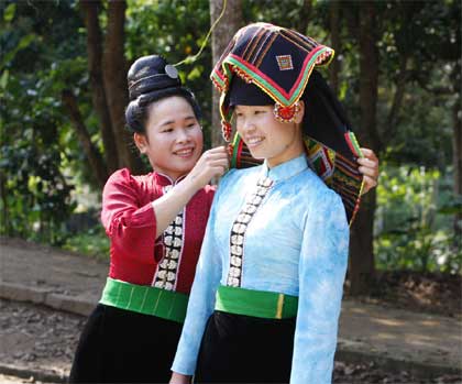 (VOVworld)- 越南黑泰族和白泰族服饰基本相同。其中黑泰妇女头上戴的“标”头巾独具文化特色且极富魅力。每块头巾都是一个用色彩、图案编成的故事,反映黑泰女性的内心和性格。
