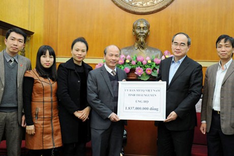 (VOVworld)- 越南祖国阵线中央委员会主席阮善仁12月30日接受太原省通过该委员会向在海上执法的力量及执行捍卫国家海洋岛屿主权任务的战士和渔民赠送的18亿越盾。