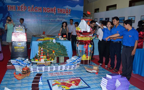 (VOVworld)- 活动期间,中部地区七省与海防市的图书馆干部参加了图书艺术拼图活动。通过图书拼成的海洋海岛艺术形象,观众可以感受到图书馆干部对书、对职业的热爱和创新精神。