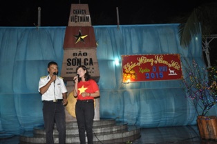 (VOVworld)- 据本台记者永锋报道,适值传统春节来临之际,正在庆和省长沙岛县各岛慰问的海军第四区146旅工作代表团与岛上官兵和居民举办2015年乙未迎春文艺晚会。