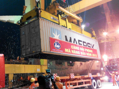 (VOVworld)- 海防港股份公司12月31日夜间迎来新年的第一艘越南籍集装箱货船。2015年,该港力争完成的货物吞吐量突破2000万吨大关,营业收入1.5万亿越盾。