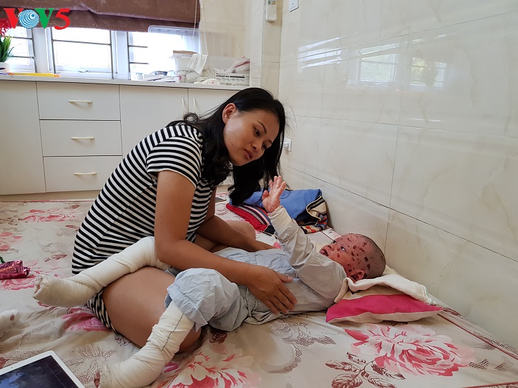 她说:“以前,在嘉莱省出生的小盛患有重病,我接小盛及其全家到我家照顾三个半月,小盛出生时体重只有1.8公斤养到5公斤就送回老家。但养小肯时,我每个月要花上亿越盾药费。只要两天不用脱脂棉和药品,小肯就会全身感染,只能活几天。2016年,小肯入院治疗三次,我家经济陷入万分困难的状况,我卖掉了两栋房子,供小肯治病。我现在住的这间是外祖父和姨母的,不是我的。”