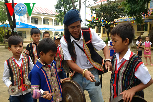 不仅教邓陈昆小学的学生和各个村庄的孩子敲锣钲和跳“双舞”,阿比艺人还热情地讲述锣钲文化的根源和它的美。这有助于培养青少年保护和弘扬巴那族传统文化的意识。