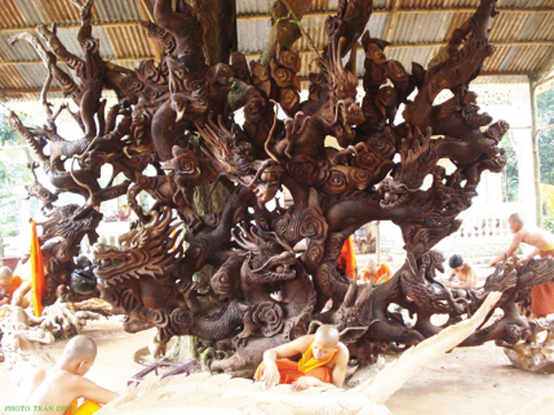 10多年来,洞寺木雕俱乐部不仅制作了数千件描绘南部高棉族同胞日常生活生产的独特精巧的产品,如四灵、九龙夺珠、双凤、双鱼、12生肖等,而且还成为希望开办木雕厂的高棉族寺庙学习观摩的教学基地。