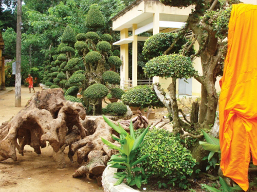 不仅洞寺,茶荣省的所有高棉族寺庙都是建在平地上且周围古木环绕。 过去,古树用于建寺后,树根一般丢弃不用,或用于烧火。洞寺第23代住持石创回忆说, 10年前,一次到永隆省弘法,偶然看见一件用天然树根制作的作品并留下很深的印象。于是。石创就说服永隆省艺人传授技艺并在洞寺成立木雕厂,一直发展到今天。