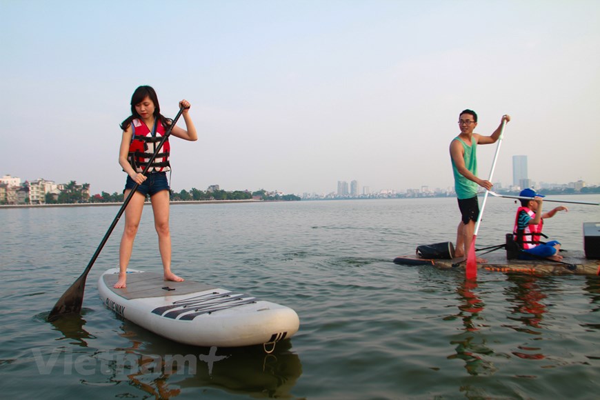 站立式划桨是来自于美国夏威夷岛的水上体育运动,被视为现代的水上冲浪。参加这项运动,运动员要根据自己的身高使用两米多长的桨板,并站在一个较长的板上划桨。目前,很多河内人有机会在西湖参加这项运动。