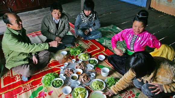 祭礼完毕后,袈文营全家老小围坐在饭桌前。他便给子孙讲述本民族过年的风俗和礼仪。现在身体还好,身为一家之主,他承担所有祭祀祖先的工作,今后不行了,家里的各项祭祀礼仪就轮到孩子们去做了。他说:“祭拜祖先时要汇报今年家里有哪些水果。木瓜是必不可少的,因为它代表着富足,还要有橙子、橘子、香蕉。桃枝可以买。如果家里的孩子种有,就用他们的。食品也要备几种,其中要事先准备熏肉,要早点做,春节时才能吃。此外,还要有甘蔗、鱼和鸡。”