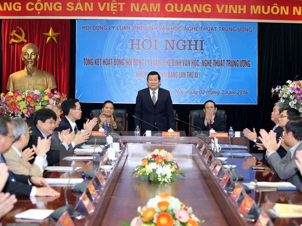 越南国家主席张晋创在会上发言时,赞扬并高度评价越共中央文学艺术批评理论委员会在本届任期内以团结、合作、积极、主动革新创新精神良好完成党和国家交付的任务。