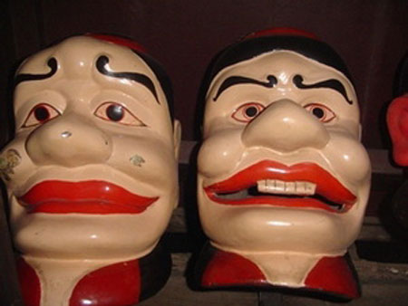 如果说一般的木偶称“傀儡子”,那么大悲寺木头木偶则被称为“圣像”。这些“圣像”均为人头像。平日,这些头像放在大悲寺的主殿,只有在举行祭祀仪式那天才请出来。据当地木偶戏表演艺人介绍,这套“圣像”的历史不少于200年。每次表演前,戏坊老人要举行仪式,身穿纱衣,头戴盘巾,烧香祭拜。“圣像”穿的“服装”称为“薄纱”,从脖子往下穿,以遮住操持木偶艺人的手。“候圣”礼仪的主要人物是六尊一般大小,脸上涂抹不同颜色油漆的头像。每尊头像颈背都有把柄,便于艺人操纵。六尊头像分为三对:一对称为“弄主”,红脸,大嘴,有胡须,象征正人君子;一对称为“金蟾”,浅红脸,象征着水稻农业;一对称为“随白”,白脸,大鼻子,大嘴巴,象征着生长繁殖。此外,还有六尊稍小一些的头像,其中包括两尊仙人头像、一尊男士头像、一尊女士头像、一尊“麦翁”头像和一尊“闪翁”头像。这些头像按古式或戴帽子或盘头发,脸上表情十分欢喜。
