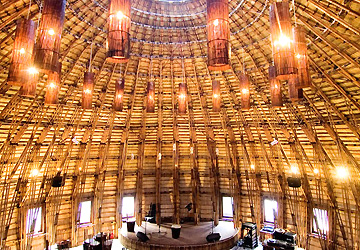 这座建筑以竹子为主要建材,把风和水带进屋里,充分利用大自然作为空气调节器,建筑构造别具特色,建筑形状极富创意而简约委婉,而且吧台、桌椅、盘子、灯罩等装饰物全用竹子制作。武忠义说:“竹子是一种不匀称,不统一的材料,因此很难用作建筑的大结构。然而,在解决上述问题后,它却变成一种比钢铁和混凝土更为独特的建材。竹子的优点是美观,因为我们可随意弯曲,而且十分自然。”