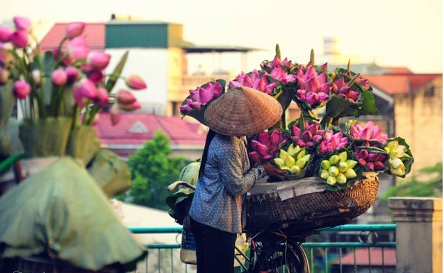 一个大簸箕,一辆自行车,一顶斗笠,这是卖花人最基本的用具。象河内这样随处可见卖花妇女和她们背后沉甸甸的鲜花簸箕的城市并不多见。花的颜色如同卖花者的心情。大街小巷留下了卖花者的足迹。载满花的自行车融入了城市的生活。