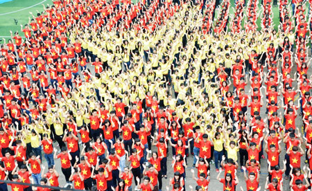 不仅决心好好学习,学生们还穿着金星红旗T恤,排成“为越南海洋海岛自豪”字样,充分展示了年轻一代对祖国的热爱。