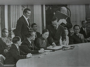 | 原越南国家副主席、越南南方革命临时政府原外交部部长阮氏苹在1973年巴黎协定上签字 |