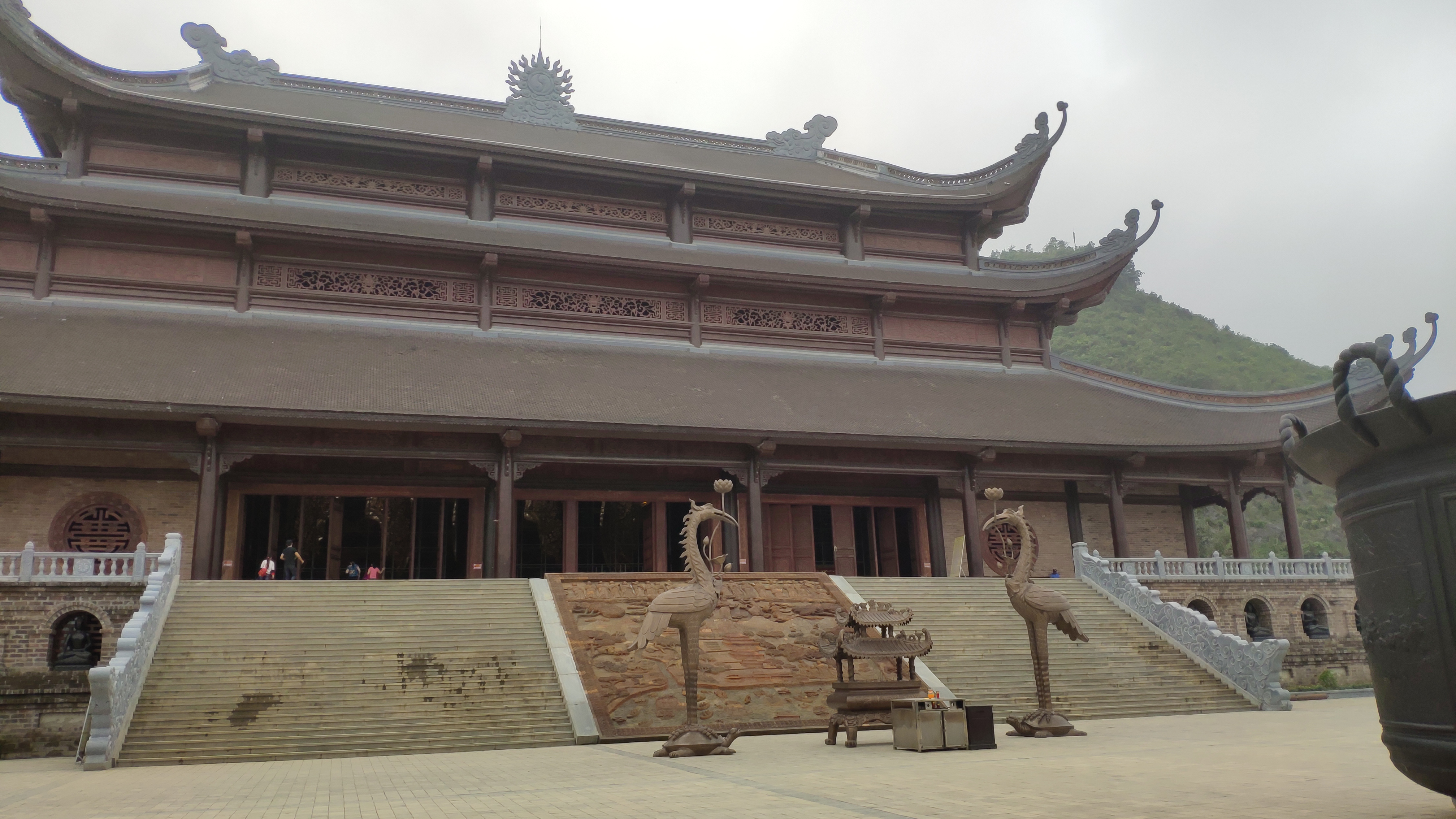 三宝殿是三祝寺最大的殿,面积为5100平方米,能容纳5000人。三宝殿高45米,其屋顶为三层式,典型的越式寺庙风格。在静谧的空间中,穿过精致的木雕门,来到正殿,这里安放三尊大佛,每尊重80吨,坐在重30吨的莲花台上,代表过去、现在和未来。