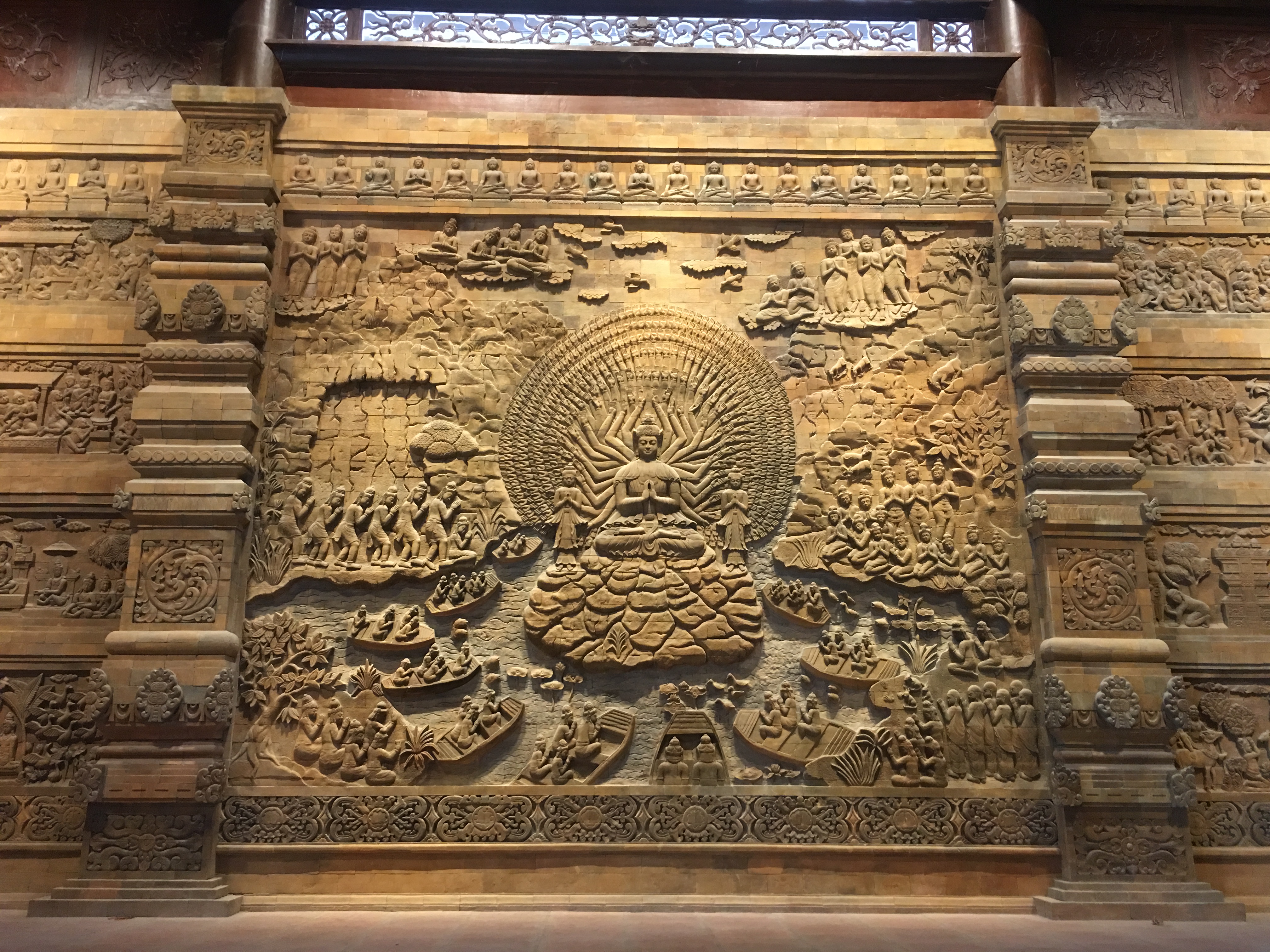 法主殿集中了讲述释迦牟尼佛诞生、得道、弘法、涅槃过程的浮雕画。观音殿里的石画讲述大慈大悲观世音菩萨具有深刻意义的故事。可以说,三大殿的1.2万幅石画就是一本巨大的佛经。这些石画由印度尼西亚艺人以现代技术在火山岩上雕刻而成。观赏这些石画,游客将领悟佛教崇高的牺牲和真善美生活等道德教导,进而过一种安平的生活。