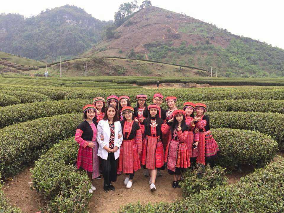 四川外国语大学学生纪星辰和她的老师与同学在越南木州茶田合影