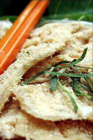猪耳夏卷吃起来也很简单,只需包上一张卷皮、洗好的生榕叶、裂叶福禄桐叶,蘸点调料就行了。食客可以把猪耳朵放在卷皮里,加上生叶,也可以用生叶直接包猪耳朵吃。
