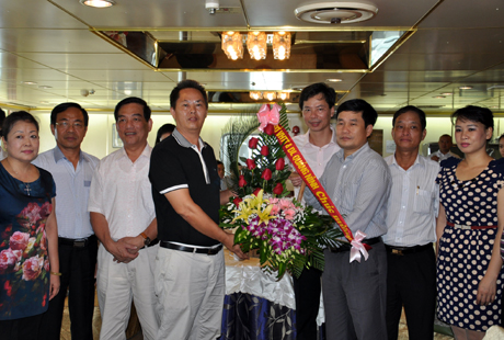 | 广宁省文化体育旅游厅副厅长郑登清向中国船员和游客赠送鲜花表示欢迎。图片来源:广宁报 |