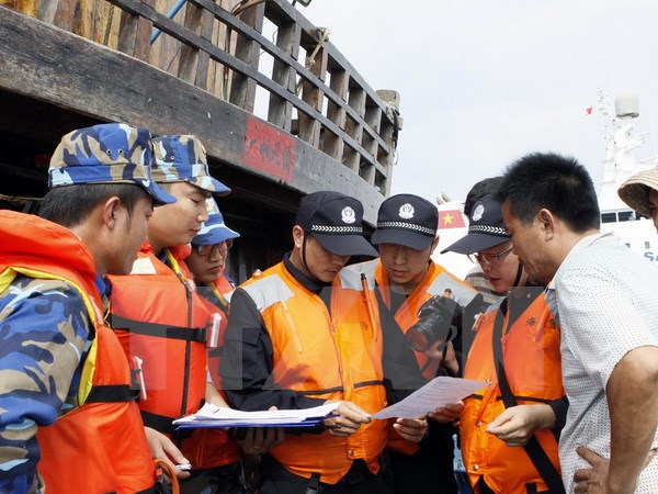 | 越南海上警察与中国海警检查中方渔船捕捞许可证 |