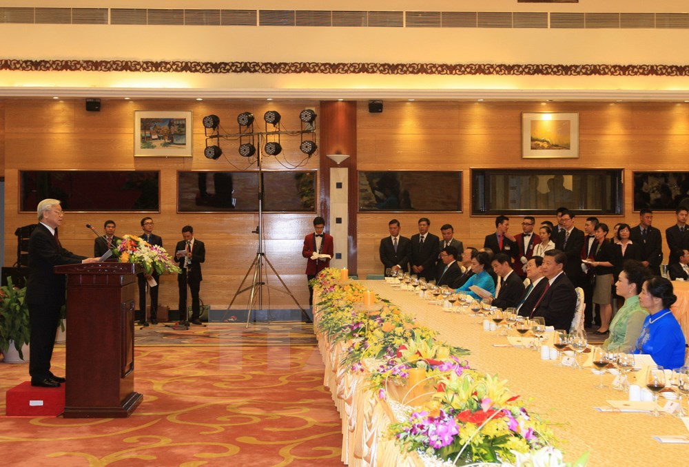 阮富仲在致辞时指出,越中两国山水相连,传统友谊源远流长,两国人民关系密切。越方一向愿与中方一道为推动两国全面战略合作伙伴关系不断深广发展作出不懈努力。