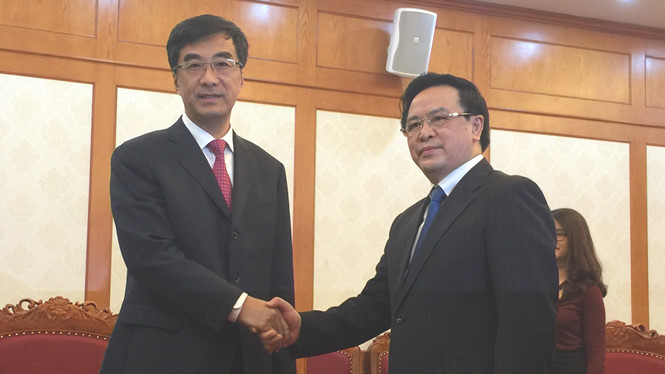 | 越共中央对外部部长黄平君(右)会见中国共产主义青年团中央委员会书记处 第一书记秦宜智 |