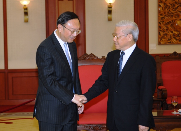 | 越共中央总书记阮富仲(右)会见中国国务委员杨洁篪 |