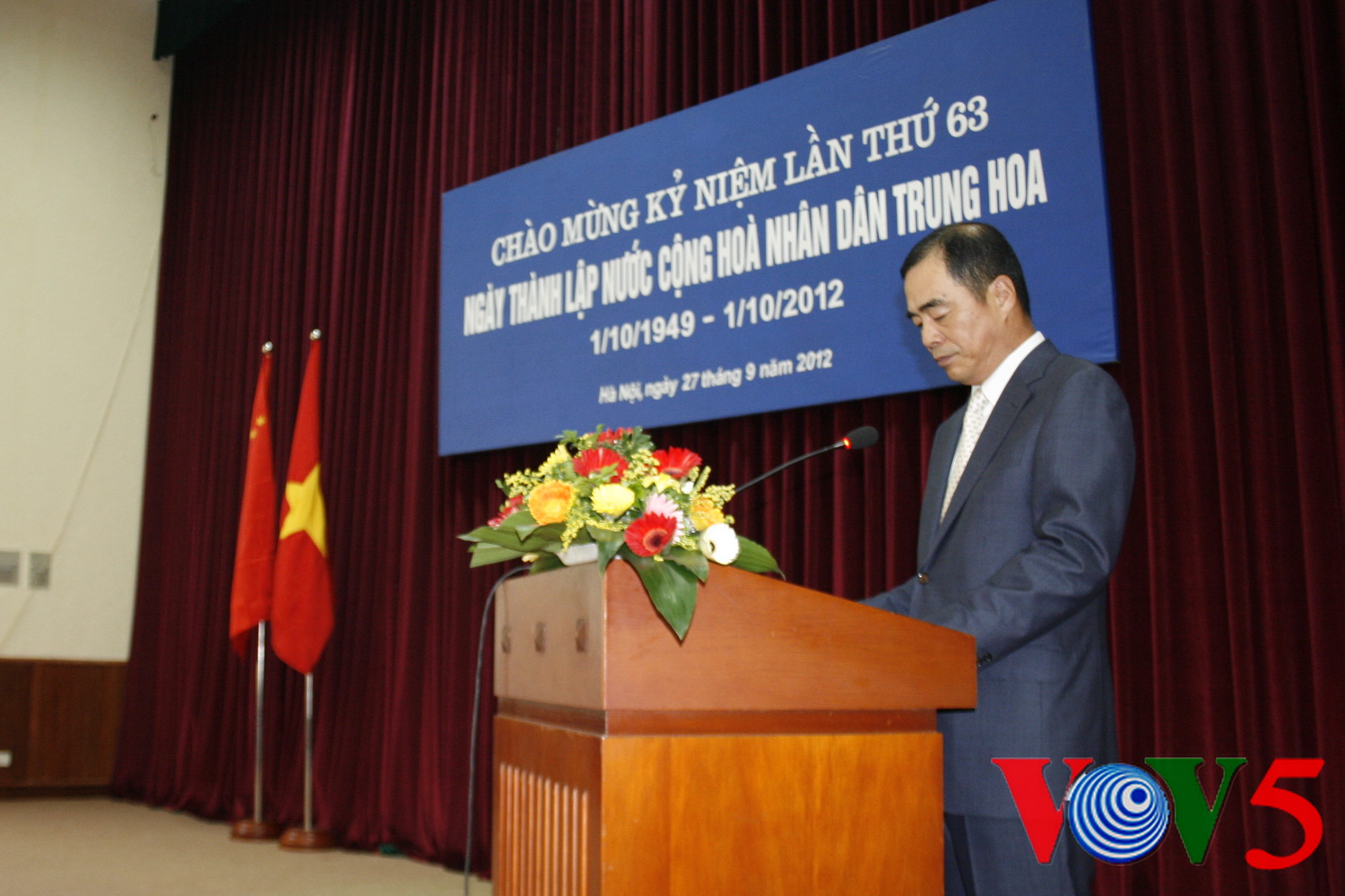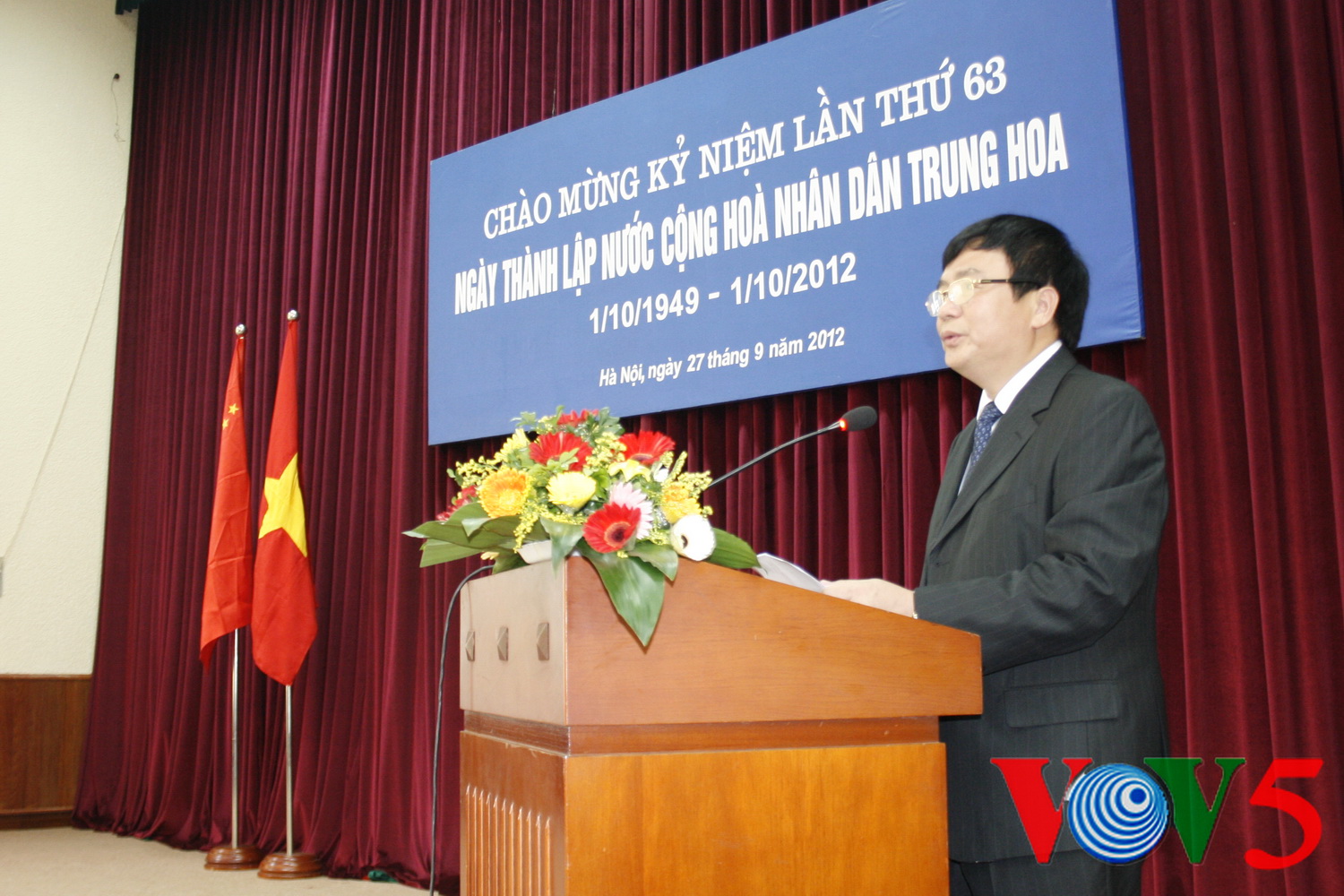 越中友协主席阮春胜在致辞时对中国国庆和中国63年来取得的成就表示祝贺,并强调,越中友协将不断努力,当好两国人民交流的桥梁,为加强两国人民友好合作关系做出贡献。